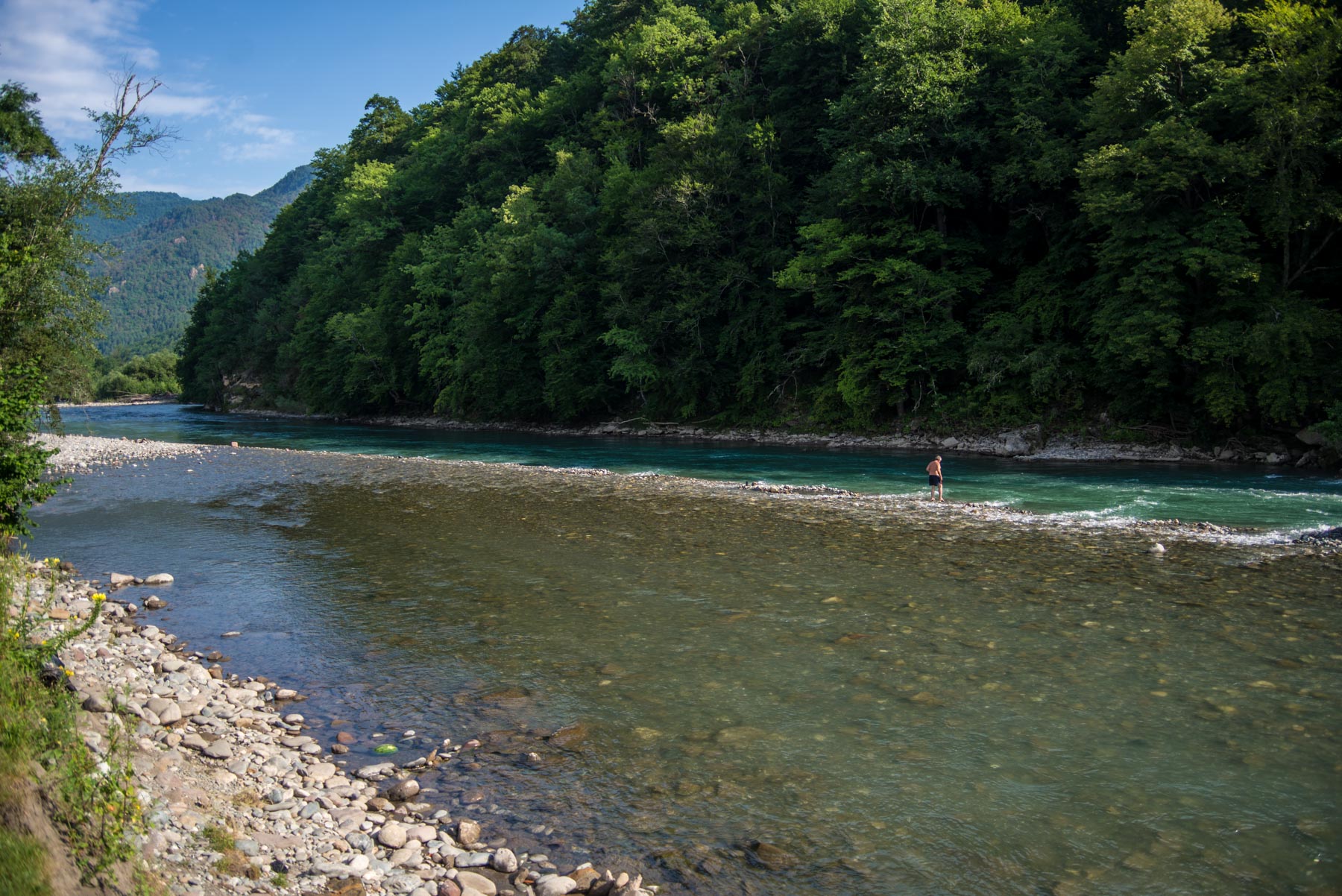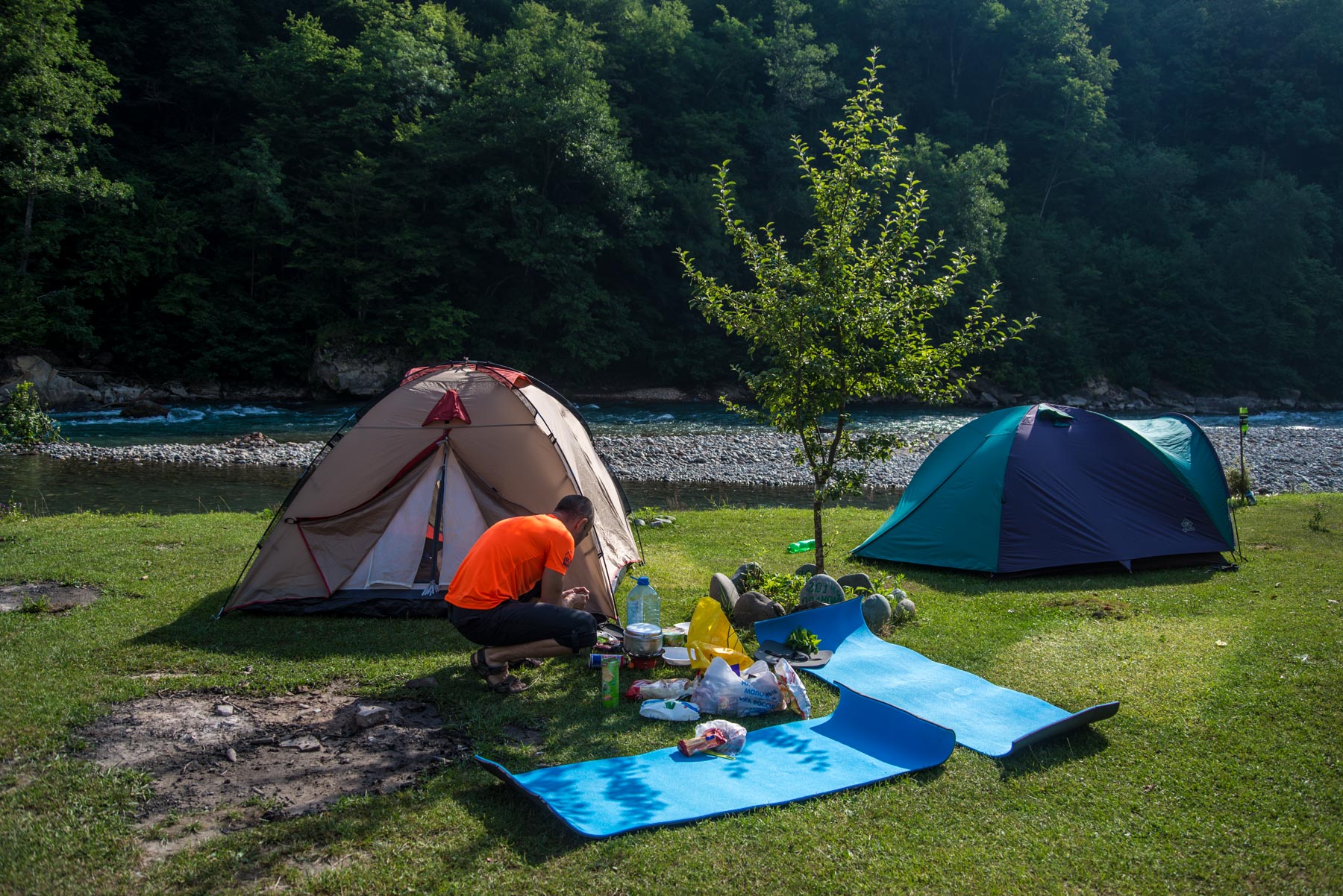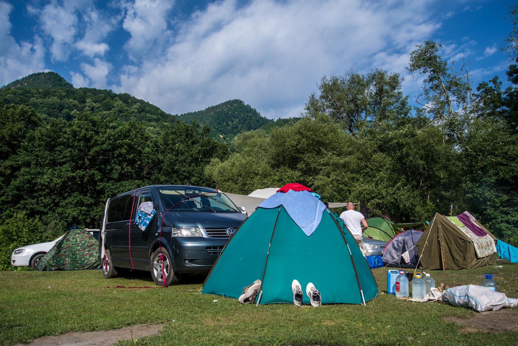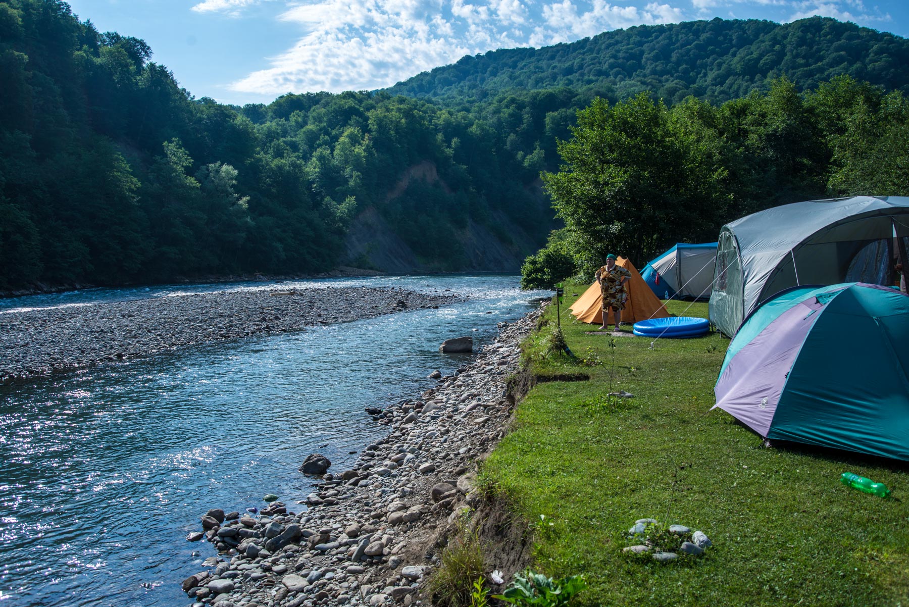 Удобное место кемпинга недалеко от поселков Каменномостский, Даховская и Хамышки в Адыгее. Кемпинг расположен на берегу реки Белой, он большой и бесплатный. Подъехать к местам стоянки можно прям на машине, есть удобные спуски к воде и каменистые пляжи.