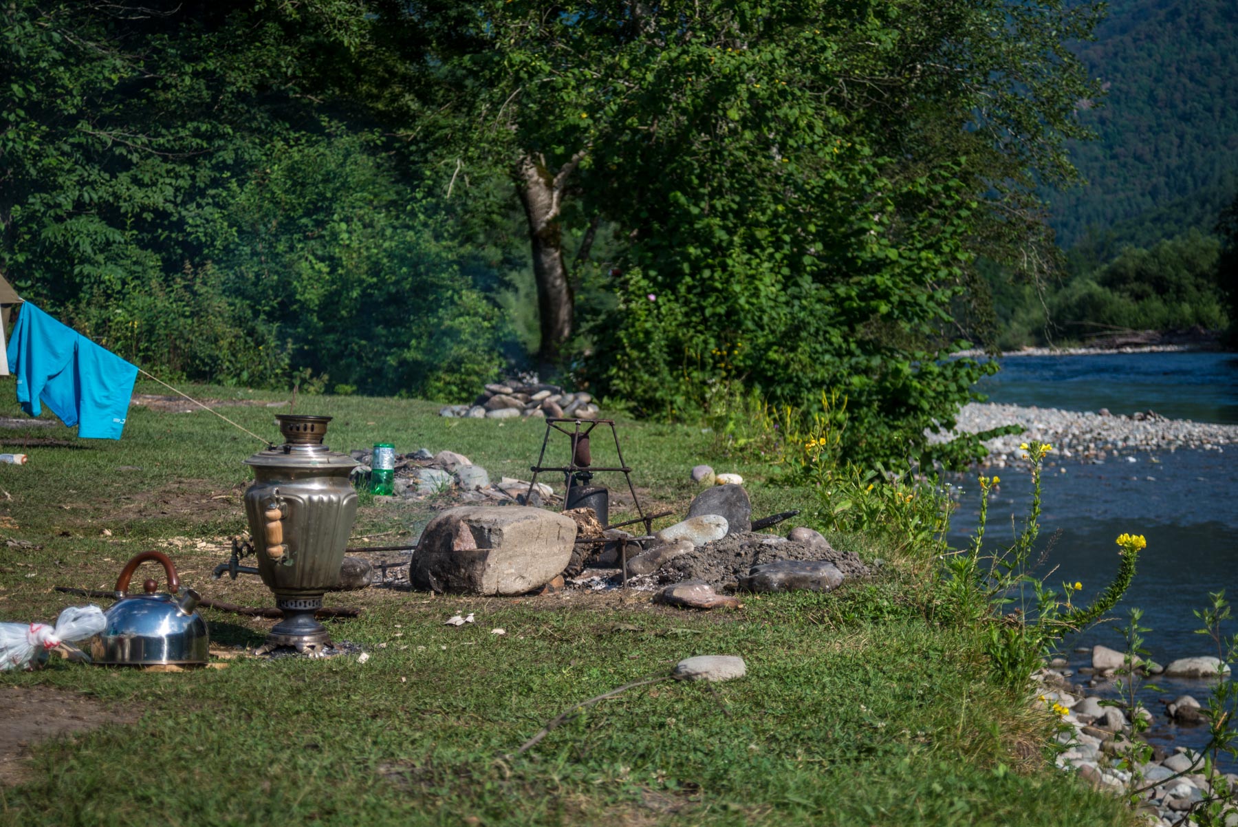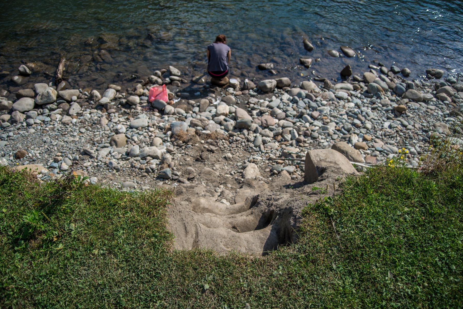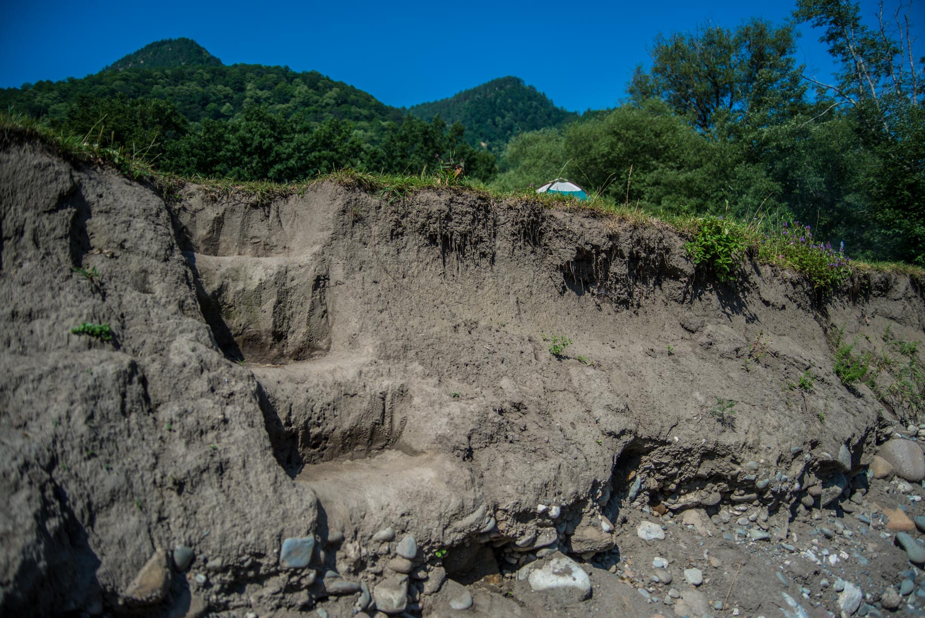 - Обитатели кемпинга прорубили несколько лестниц в земле, по которым удобно спускаться к речке,