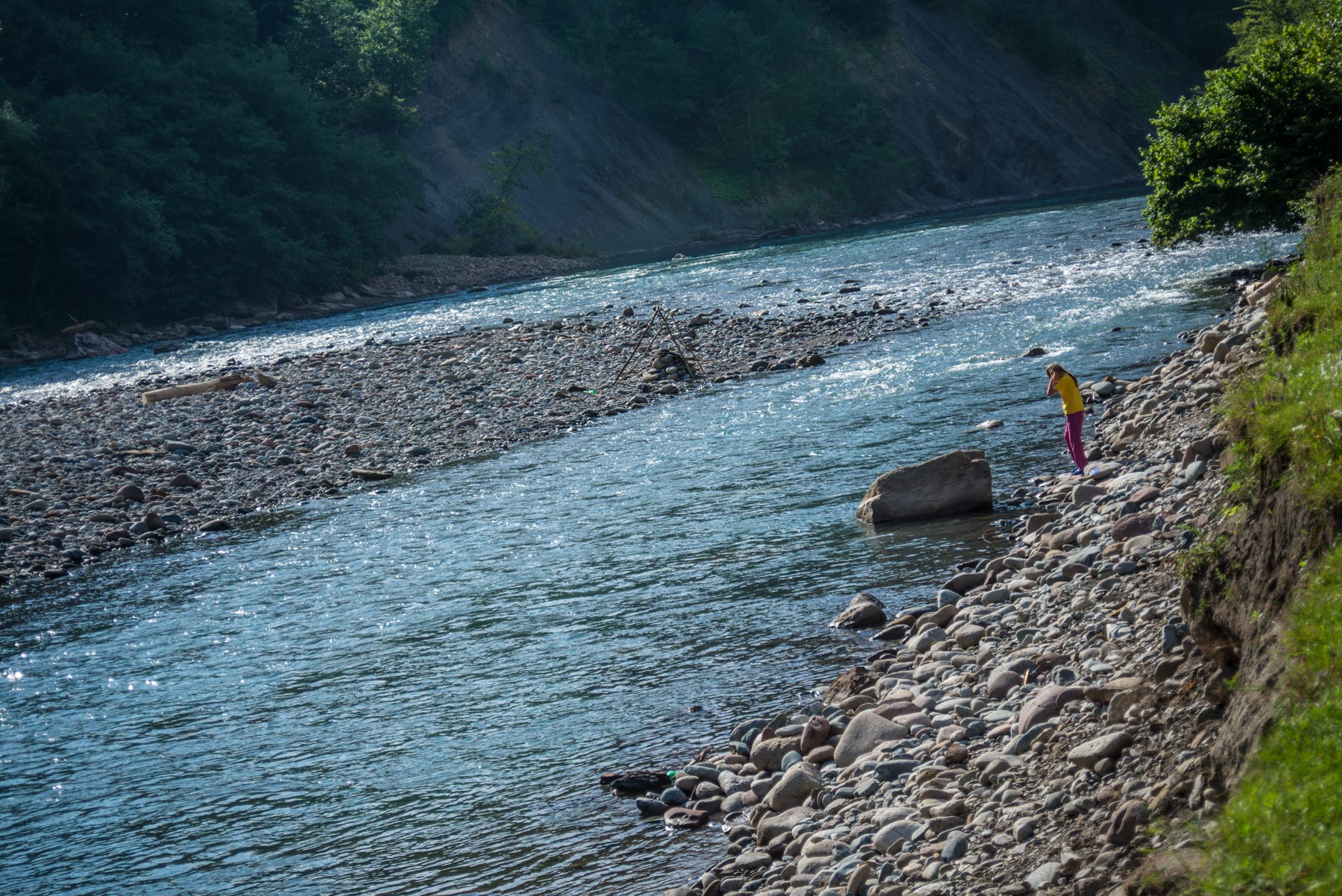 - Река здесь имеет два русла – основное и побочное, где вода течет медленно, хорошо прогревается. Здесь течение слабое, поэтому безопасное для детей,
