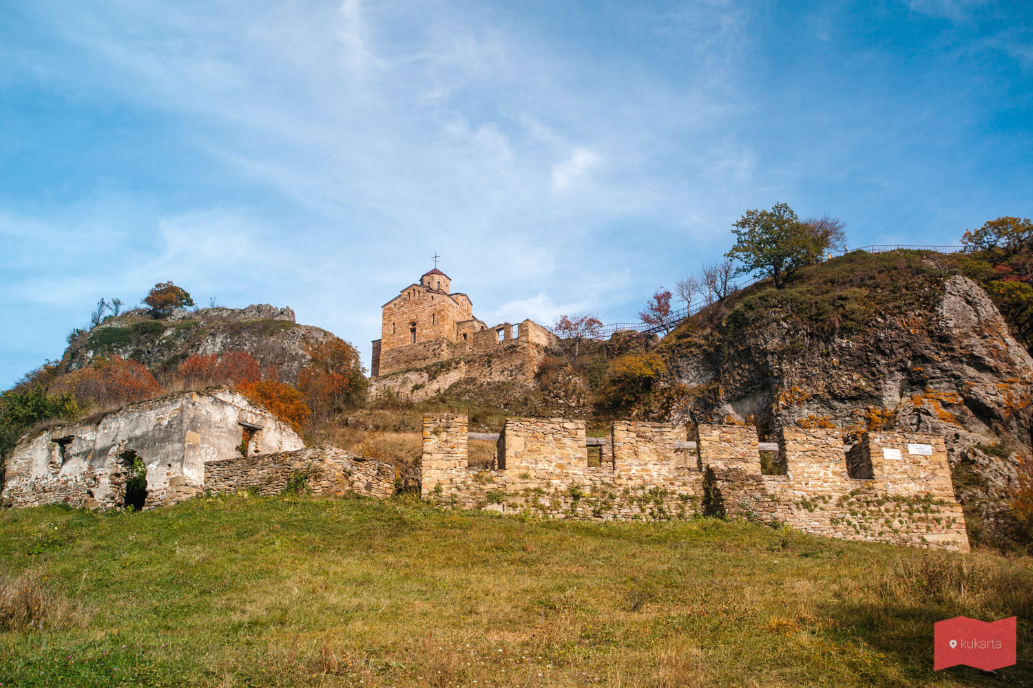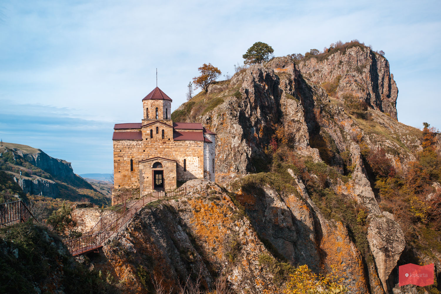 Добраться сюда не составит никакого труда. Если ехать в сторону Карачаевска, то не доезжая 7 км до города, с правой стороны будет съезд на дорогу, ведущую к храму, там есть табличка с указателем. На машине можно доехать прямо до начала подъема к храму.