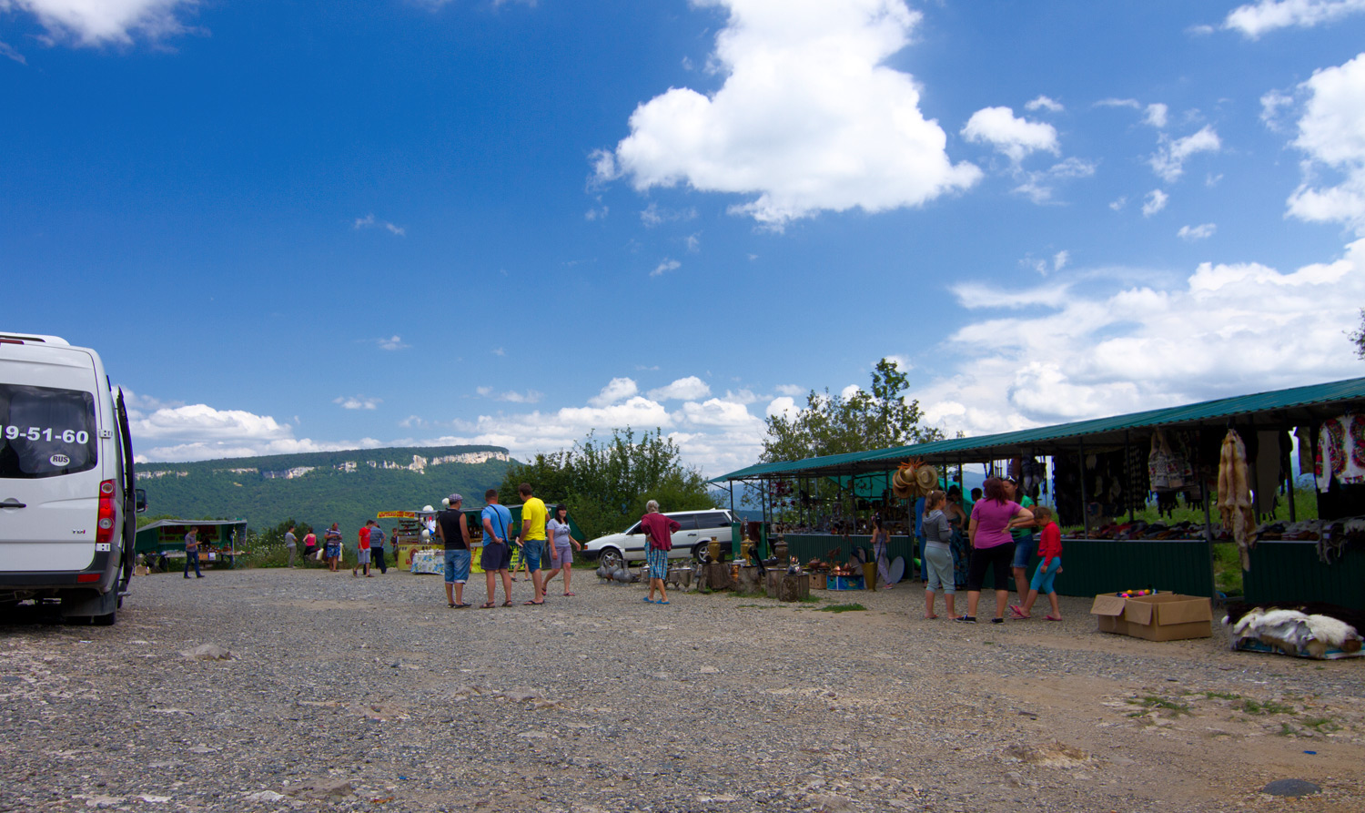 Узнать смотровую площадку очень просто, с левой стороны от вас будет небольшая парковка, возле которой расположен рыночек – тут и останавливайтесь. На рынке можно купить сувениры, а так же сделать фото в бурке и папахе на фоне горного пейзажа. Стоимость съемки в 2015 году была 50 рублей. Помимо примерки, одежду можно купить, в июле 2014 папаха стоила – 1000 рублей. Здесь же можно попить чай с медом.