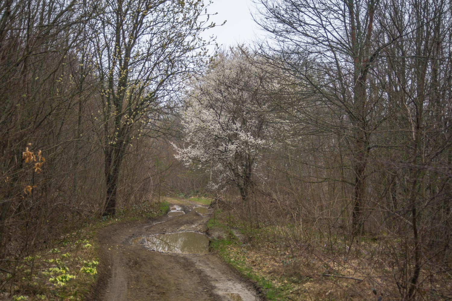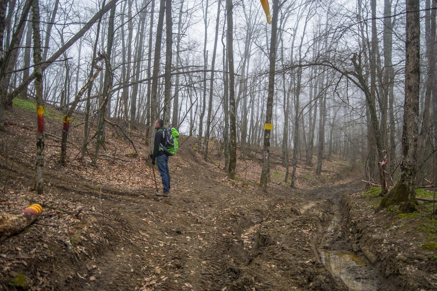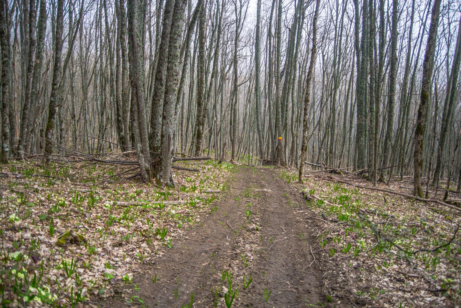 Тропа начинается прям от бетонной дороги, которая ведет на вершину. Обратите внимание: вправо отходит грунтовая дорога, на деревьях при этом можно разглядеть оранжево-красные метки. Дорога доступна не только для пешеходов, но и для квадроциклов и внедорожников.