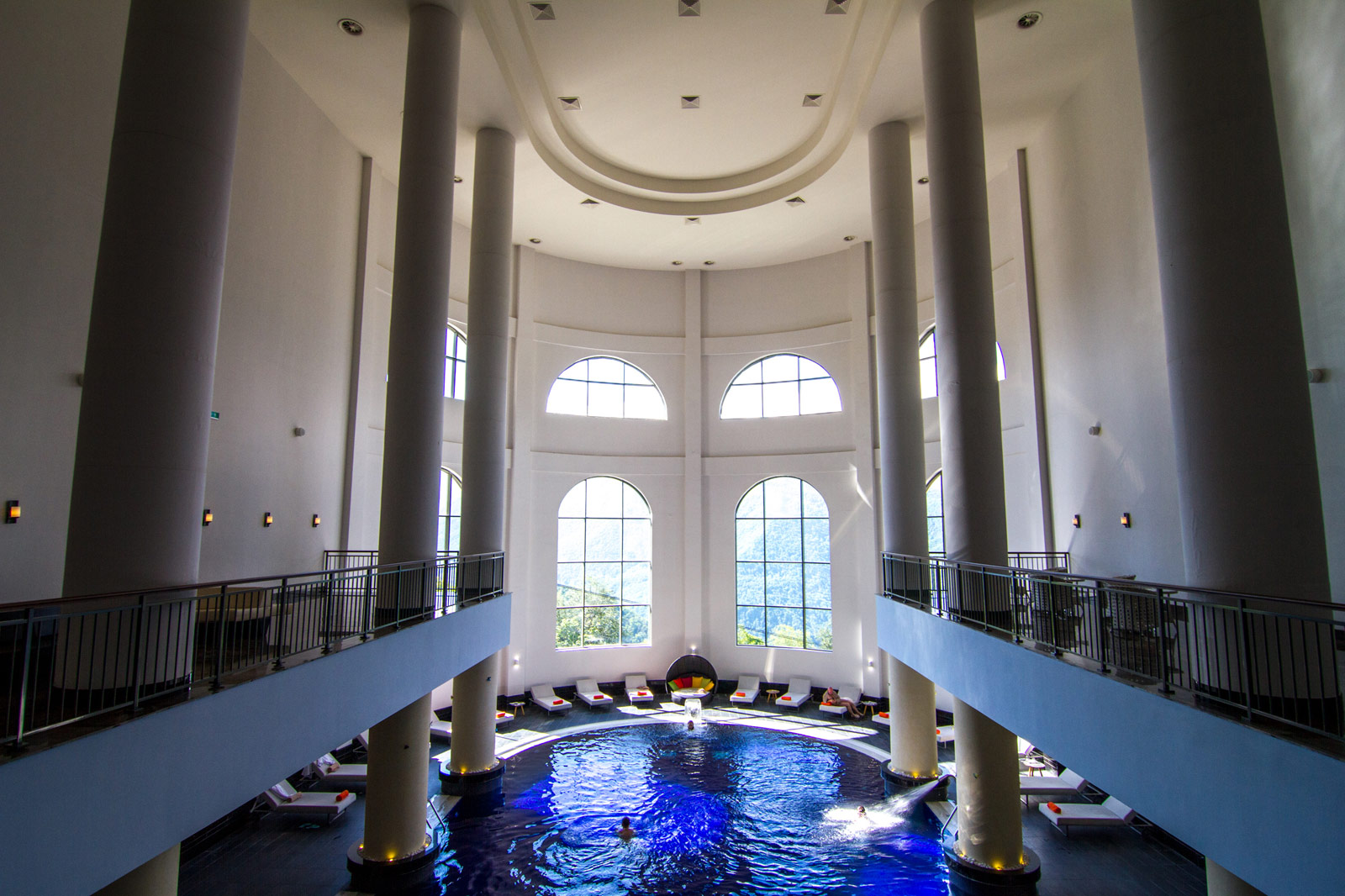 Общая площадь комплекса составляет 3 000 м.кв. На первом этаже находятся: салон красоты, релакс и термальная зоны, крытый бассейн глубиной 150 см и площадью 345 м3 длинной 23 метра с двумя гидромассажными чашами температурой воды +36 градусов и глубиной 90 см. с панорамным видом на горы . В отдельной тихой зоне расположены финская и русская сауны, паровая комната, бочки с ледяной водой, обливное ведро и дополнительное джакузи с видом на горы.