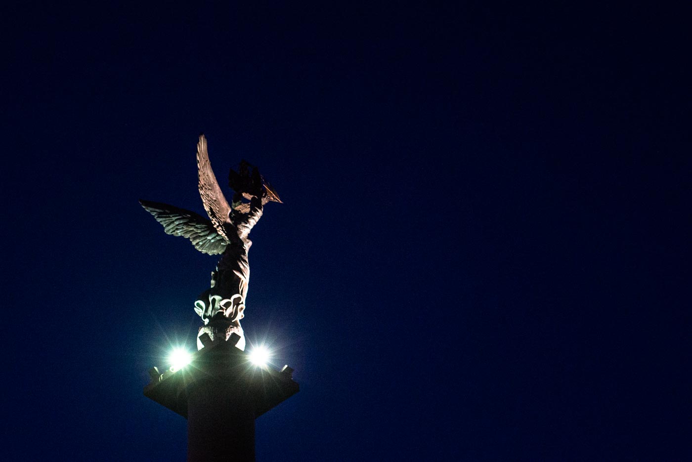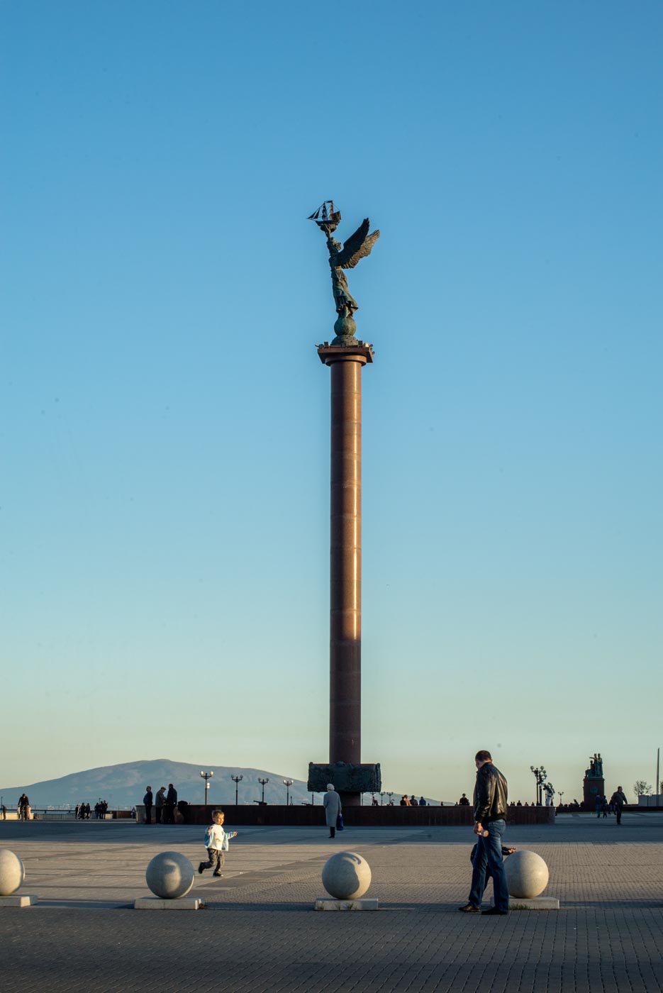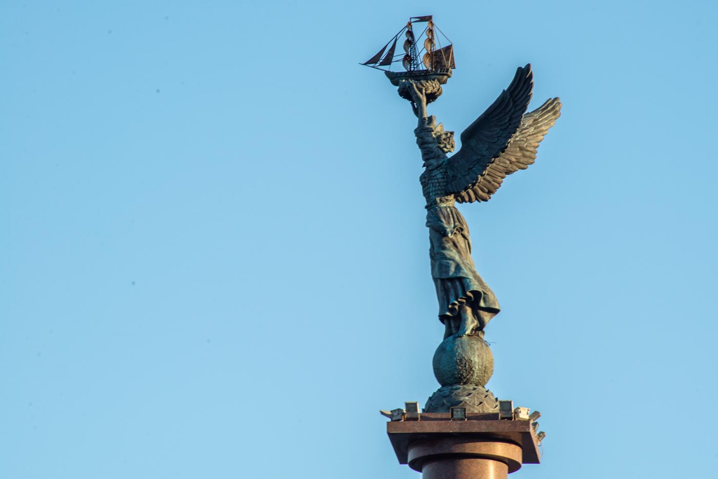 Общая высота конструкции без основания – 7,5 м, поэтому создавали ее по частям. Отливали в Ростове-на-Дону. Скульптура представляет собой ангела, который держит в руках корабль. Установлена она на высокой гранитной стеле на набережной напротив корабля-памятника “Михаил Кутузов”.