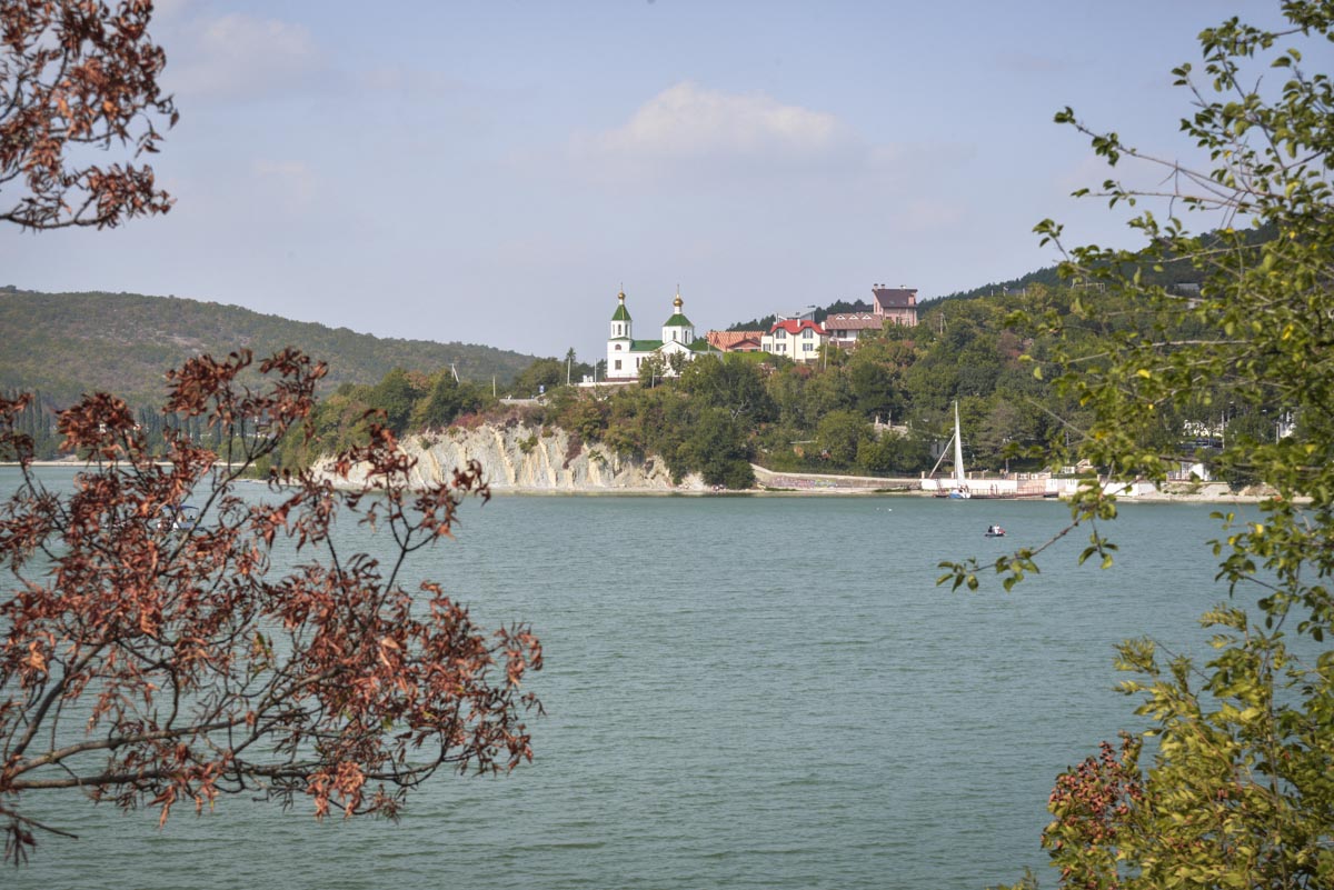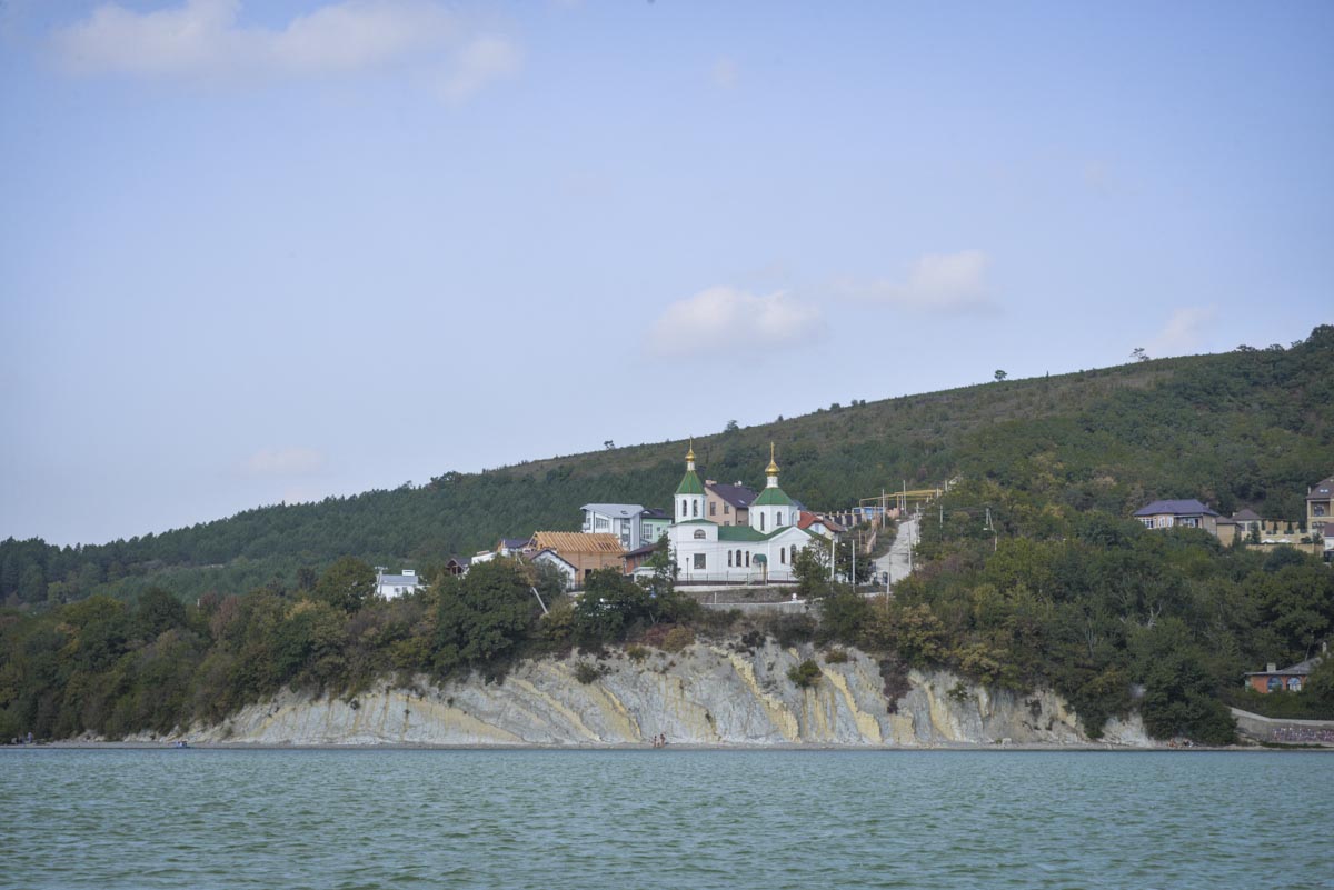 Церковь Ксении Петербургской на берегу озера Абрау со стороны сквера на берегу озера Абрау.
