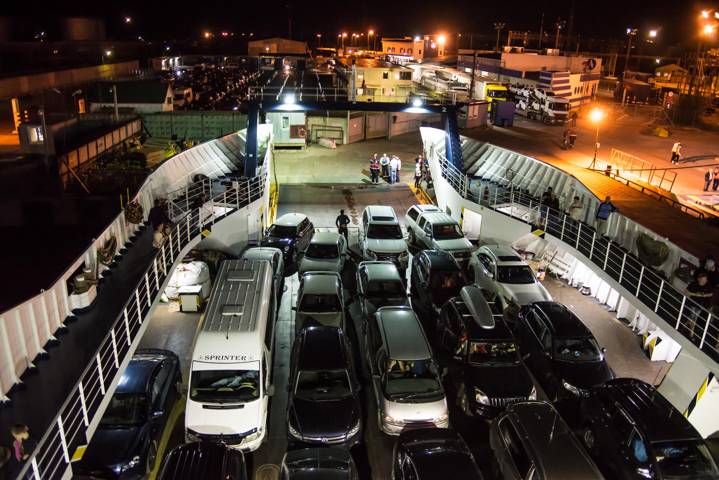 Автомобили, фуры и автобусы перевозятся на одном пароме. Есть паромы, где транспорт размещается только на нижней палубе, и двухпалубные грузовые судна. Все пассажиры на время движения покидают машины и выходят на верхнюю палубу. Есть открытый и закрытый отсек. Паромы имеют на борту туалеты и кафетерий, где можно приобрести пирожки, мороженое, пиво, сладости и кофе. Продолжительность движения парома не превышает 20 минут – ширина Керченского пролива в самом узком месте – всего около 5 км.
