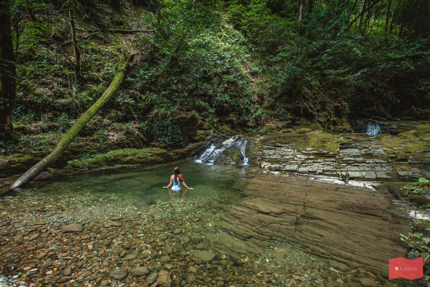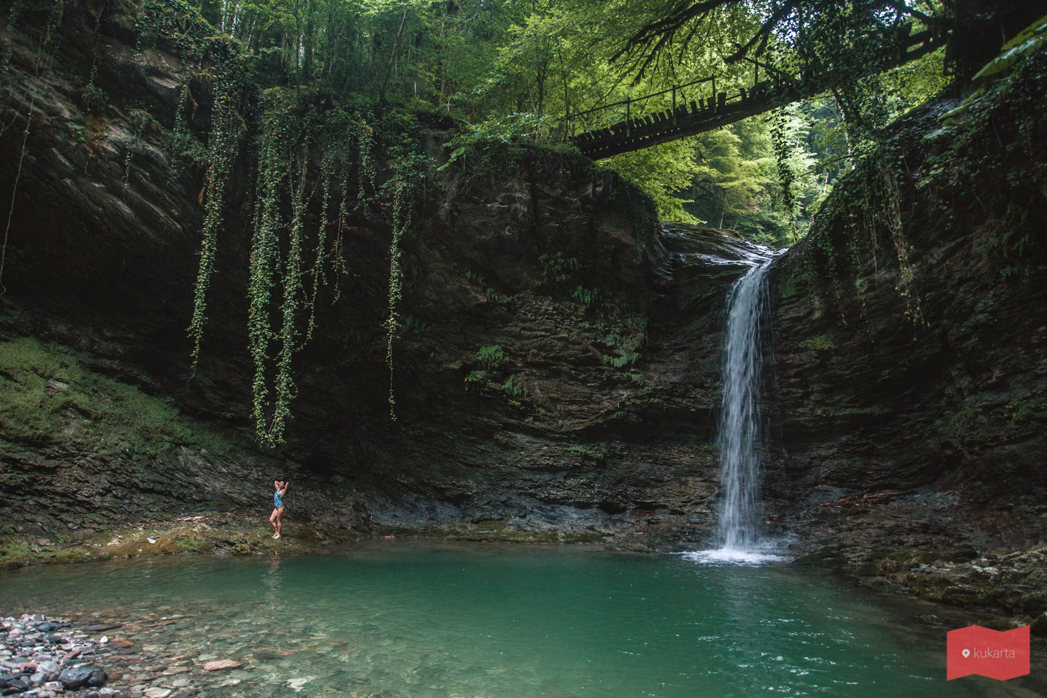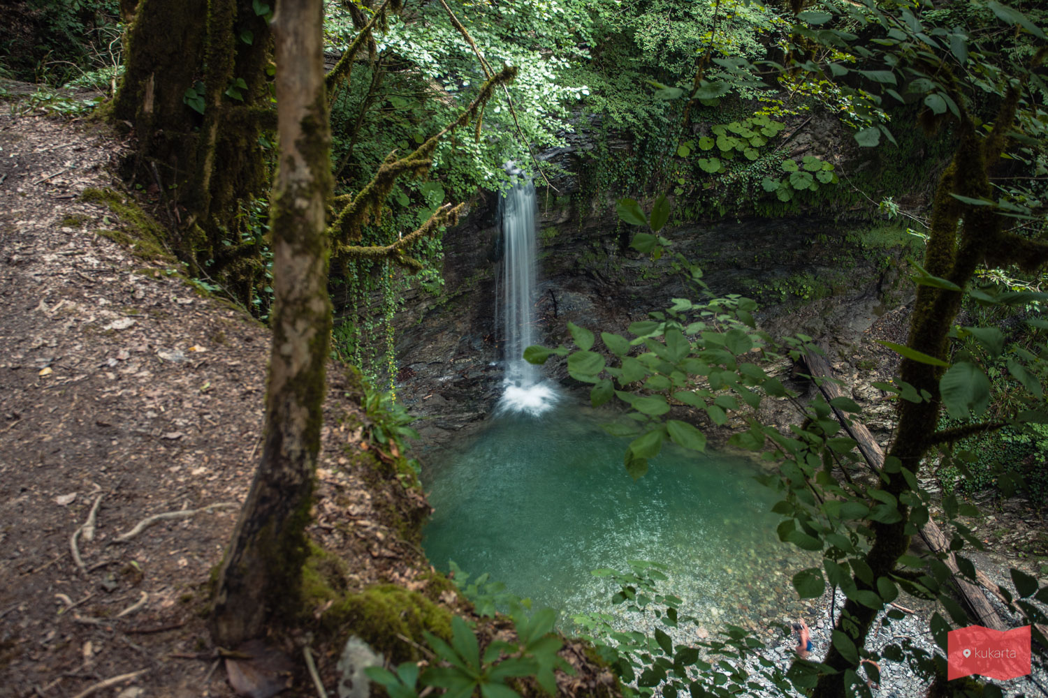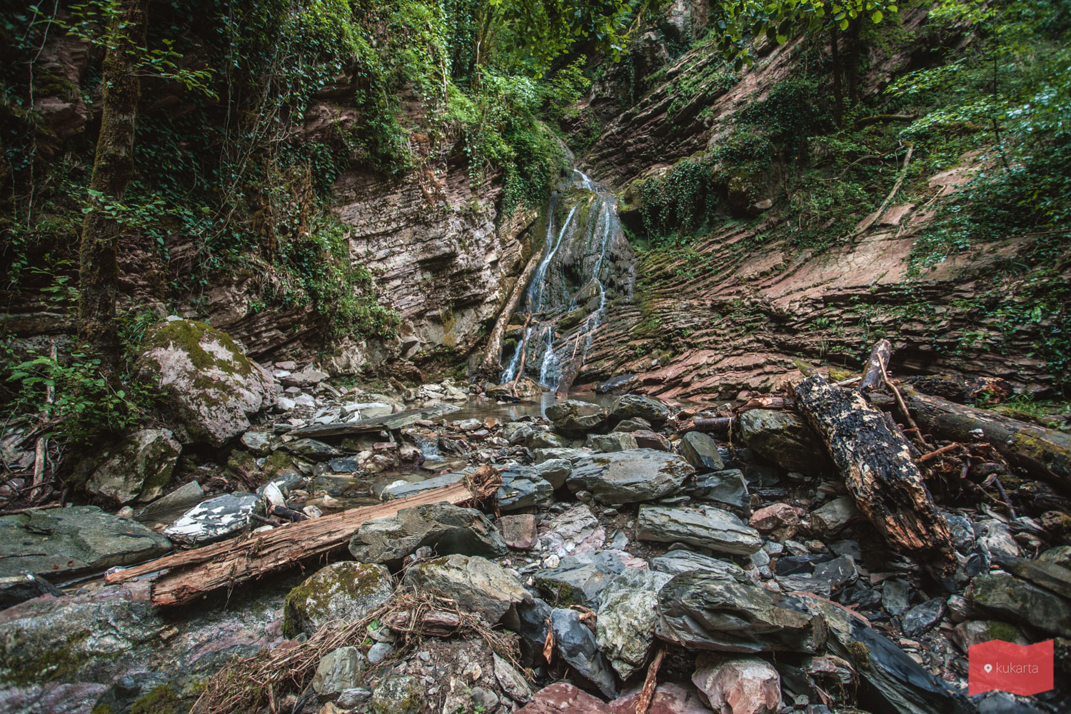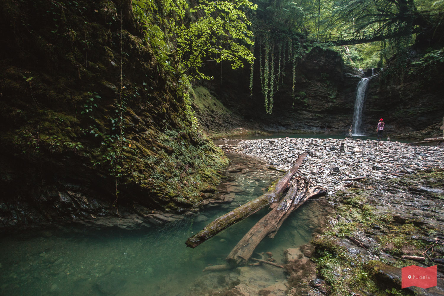 Побыв на ручье Сванидзе, необходимо вернуться назад и продолжить путь к Нижнему водопаду Ажек, двигаясь по тропе, проходящей по красивому лесу.