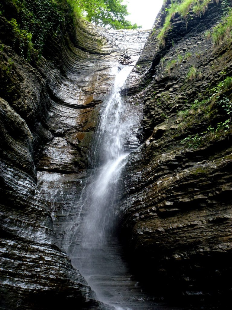 Со стены ущелья срывается большой трехступенчатый водопад необычайной красоты. Его высота составляет тридцать метров. Падая, вода белым потоком отправляется в большой водоем, расположенный у подножья. Красота этого ущелья и водопадов, расположенных в нем, побудила коренных жителей этих мест, шапсугов, дать ему название «Псыдах», что переводится как «Красивая вода». Если подняться по течению реки выше Псыдах, то в пятистах метрах от этого места можно увидеть еще один каскад, насчитывающий четыре водопада. Самый красивый, по мнению многих, наивысший среди четырех водопадов, нижний, носит название Шапсуг. Шапсуг представляет собой двухступенчатый водопад, имеющий высоту около двадцати метров. Вода в этом водопаде ниспадает с уступа на каменную наклонную площадку, скользя по ней, снова падает вниз широкой струей.