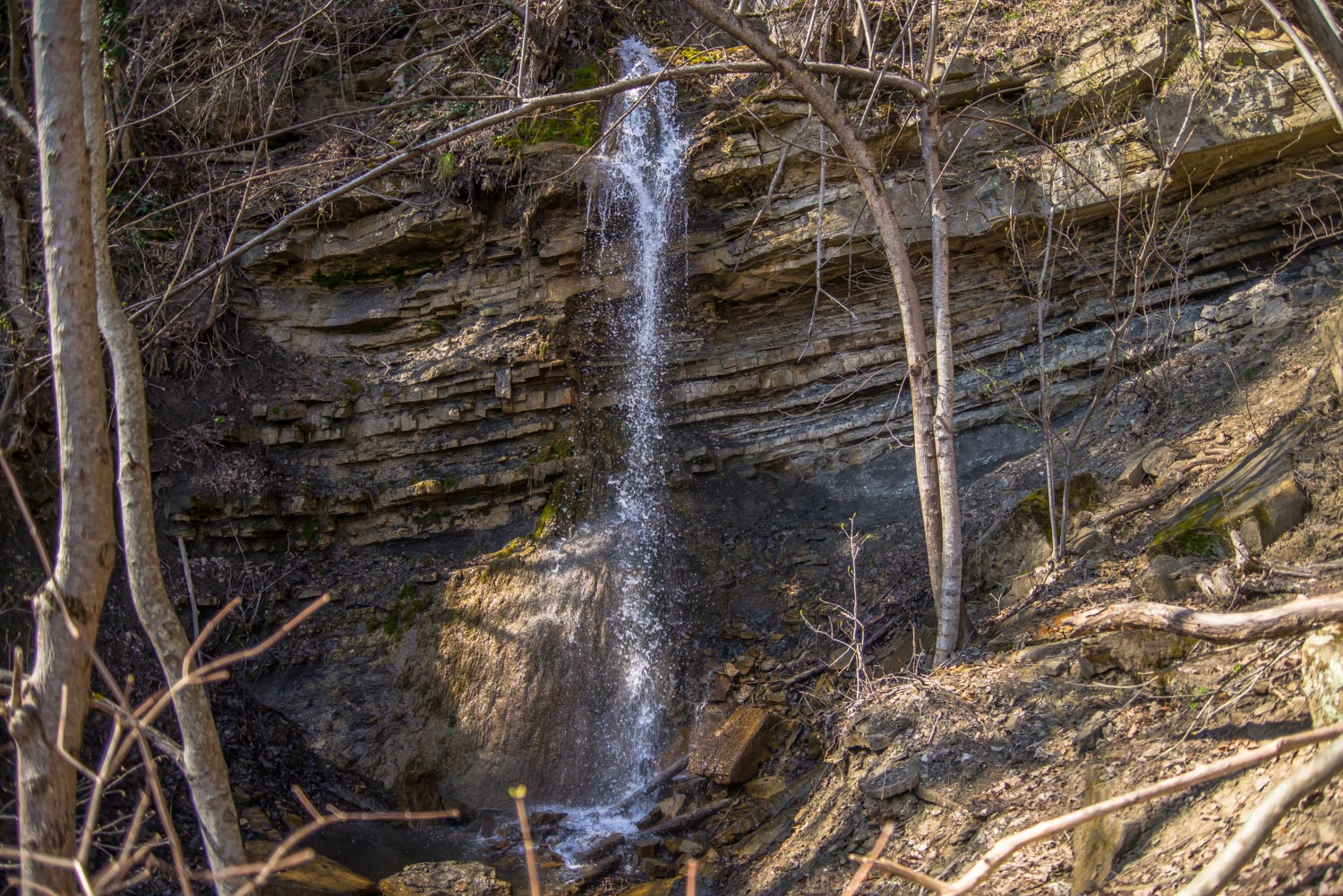 Водопад Утаенный имеет такое название, потому что он как бы «скрылся» от нахоженных тропинок и глаз туристов. Совет: лучше смотреть водопад весной или осенью во время дождей – тогда шум его ниспадающих вод слышен за полкилометра. Летом каскад пересыхает. Высота водопада около 11 метров. Выше него можно найти еще около двадцати мелких «водопадиков» 2-4 метровой высоты. Самый примечательный из них – водопад Мужские слезы.