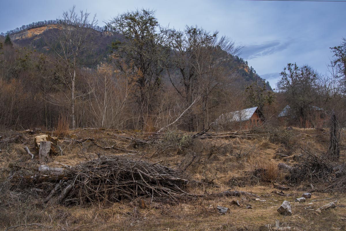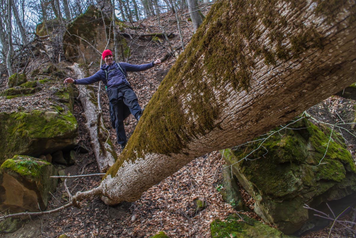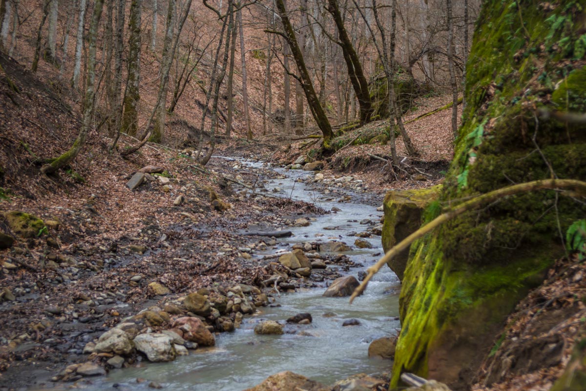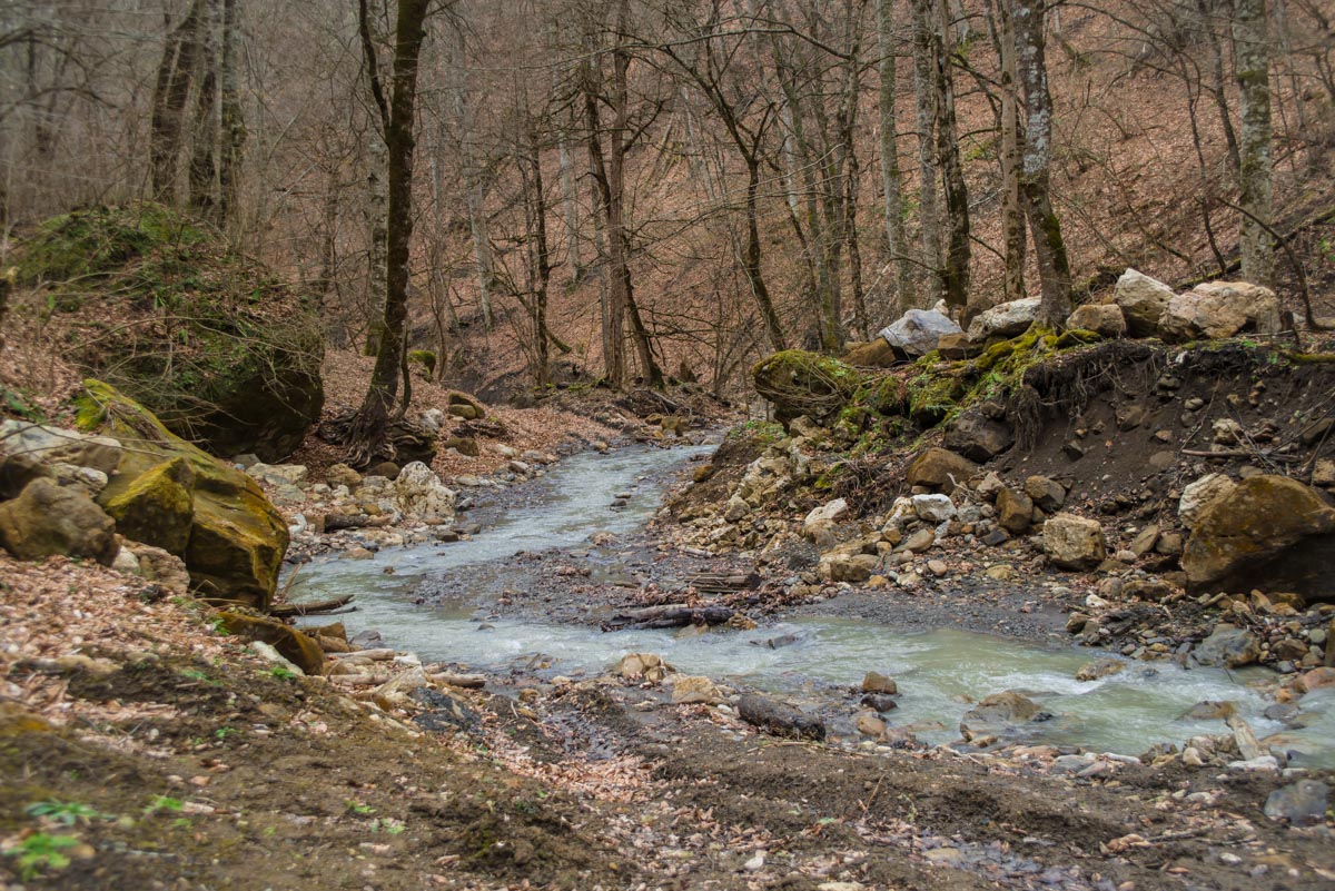 Естественно, нам сразу захотелось его найти. Забив указанные координаты, мы отправились на поиски водопада и тайника. Сперва маршрут идентичен тому, что ведет к водопадам Кутанки. Начинается он сразу возле горы Монах, на въезде в Хамышки и идет вдоль реки Бзыхи. Начинать движение можно как по левому, так и по правому орографическому берегу реки (если смотреть вниз по течению, то по правую руку от вас будет правый берег, а по левую – левый). Если вы выберете правый, то в какой-то момент придется переправиться на другой берег. Автомобильная дорога для вездеходов упрется в брод, справа вы увидите мостик, а слева – упавшее бревно, которое тоже может выполнить функцию моста.