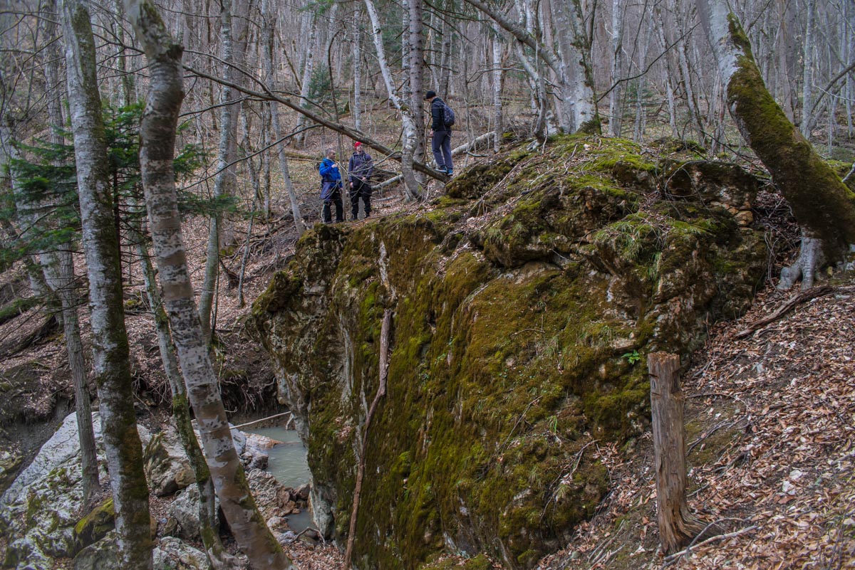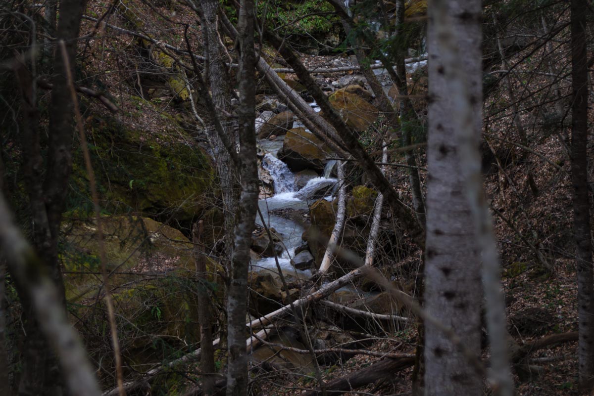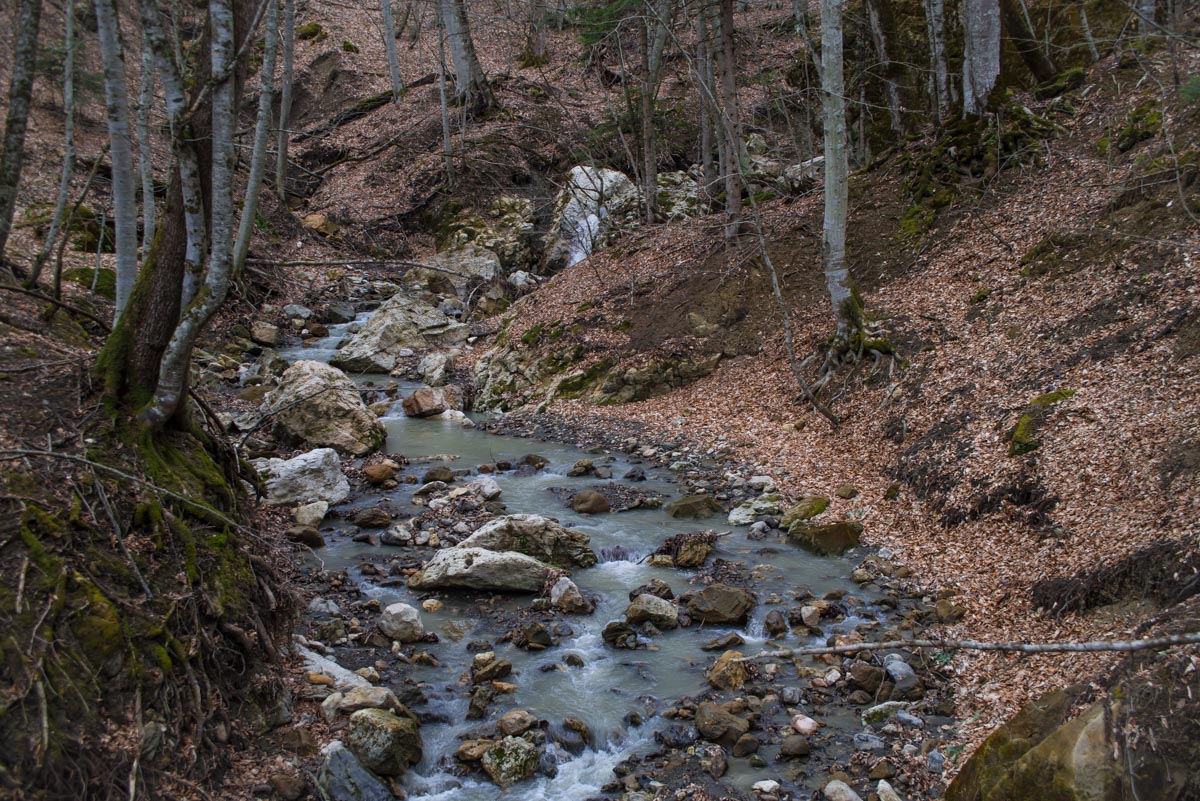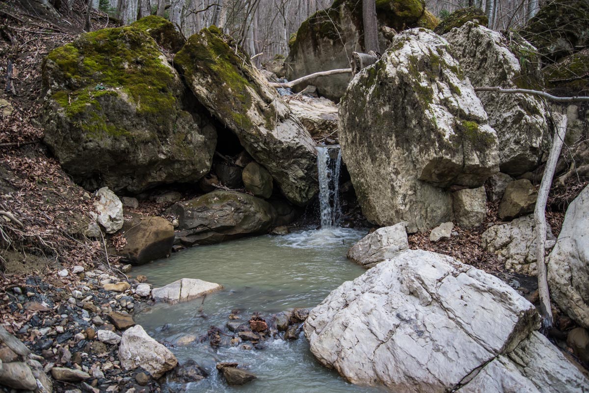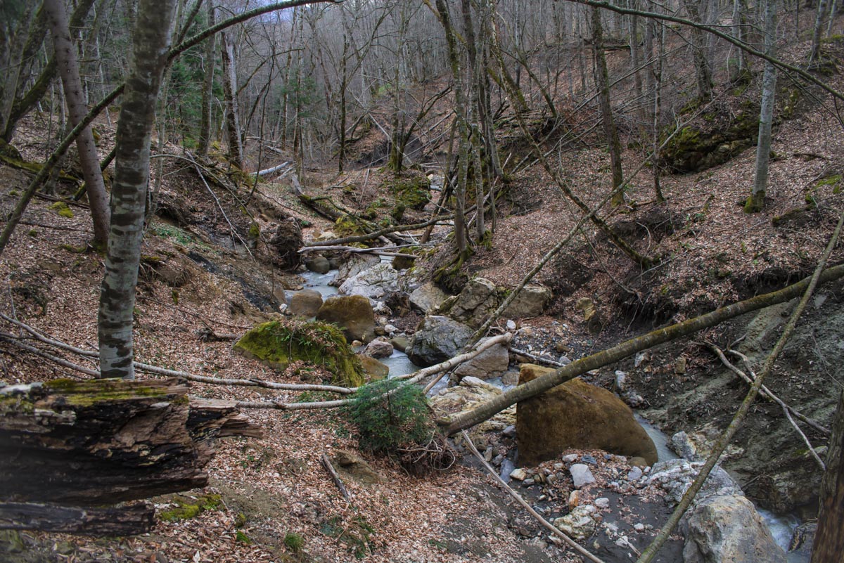После брода идите все время по дороге до развилки. Вам нужно туда, куда ведут красно-белые метки, направо. Следующая развилка будет через несколько сотен метров, и вот теперь нужно выбрать то направление, которое не сопровождается метками, то есть взять левее. Дальше дорога становится все хуже и хуже, а в какой-то момент и вовсе пропадает. Держитесь все время реки, тропы здесь нет, идти вдоль нечищеного русла очень неудобно. Лучше прокладывать путь поверху, через лес. Спустя какое-то время вы доберетесь до слияния двух ручьев в одну реку. Следует выбрать правый приток и все время подниматься наверх вдоль него. Правый орографический берег для этого удобнее, но в целом выбор не имеет значения. Если никуда не сворачивать, то совсем скоро вы упретесь в водопад.