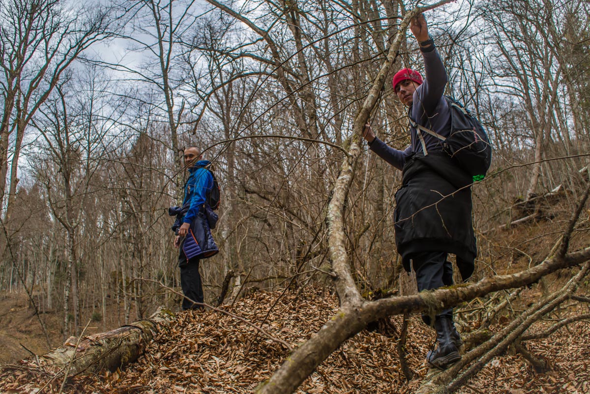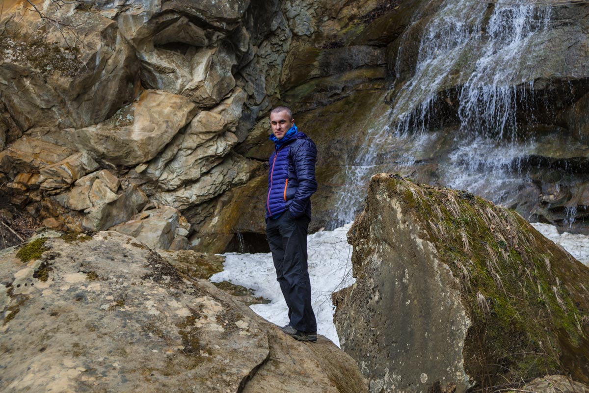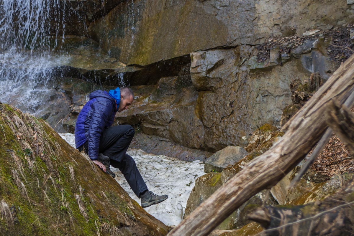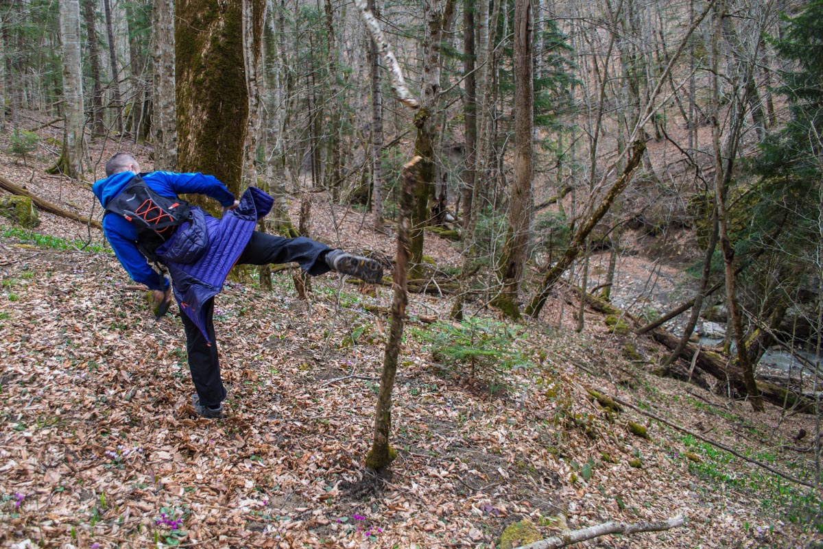 После брода идите все время по дороге до развилки. Вам нужно туда, куда ведут красно-белые метки, направо. Следующая развилка будет через несколько сотен метров, и вот теперь нужно выбрать то направление, которое не сопровождается метками, то есть взять левее. Дальше дорога становится все хуже и хуже, а в какой-то момент и вовсе пропадает. Держитесь все время реки, тропы здесь нет, идти вдоль нечищеного русла очень неудобно. Лучше прокладывать путь поверху, через лес. Спустя какое-то время вы доберетесь до слияния двух ручьев в одну реку. Следует выбрать правый приток и все время подниматься наверх вдоль него. Правый орографический берег для этого удобнее, но в целом выбор не имеет значения. Если никуда не сворачивать, то совсем скоро вы упретесь в водопад.