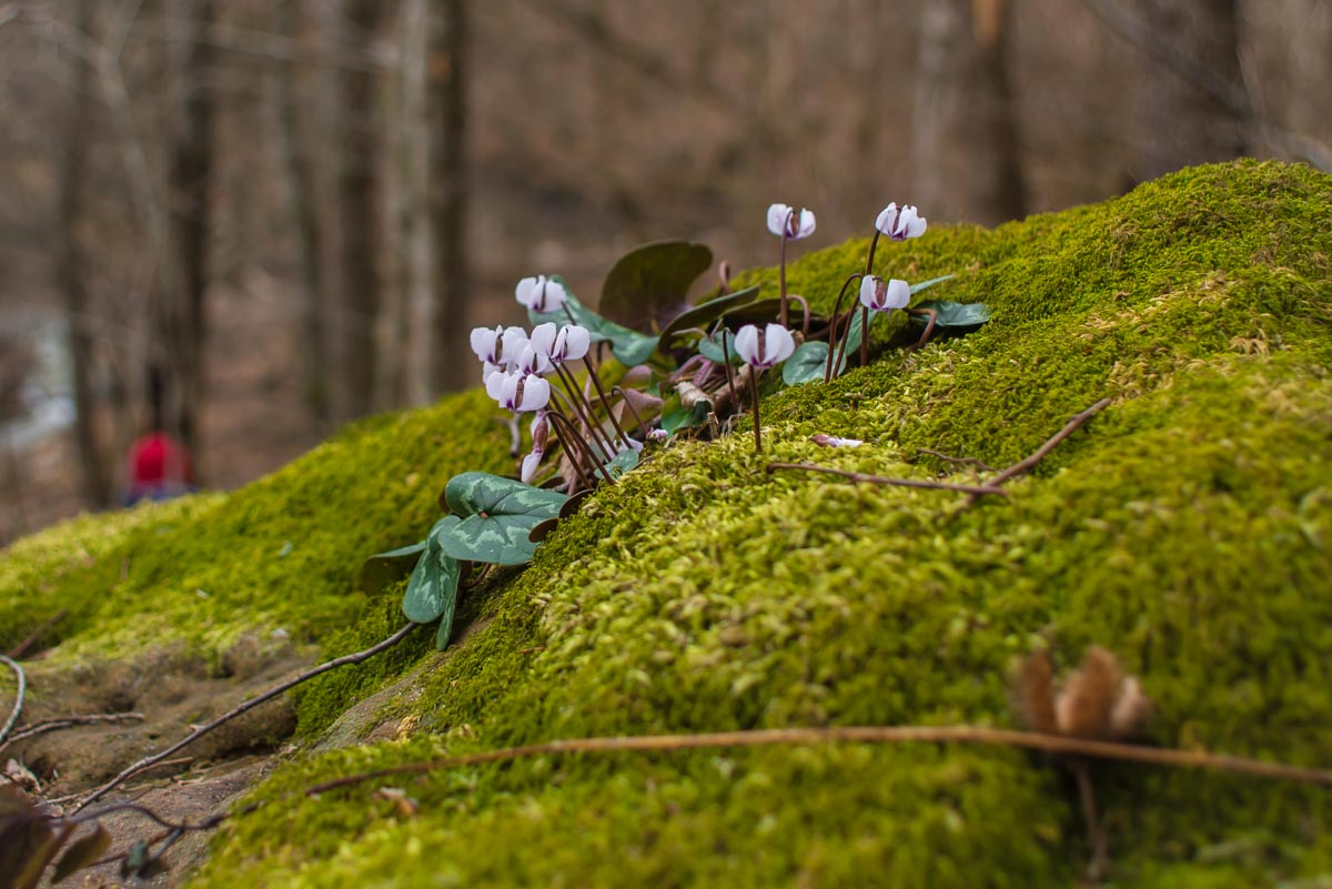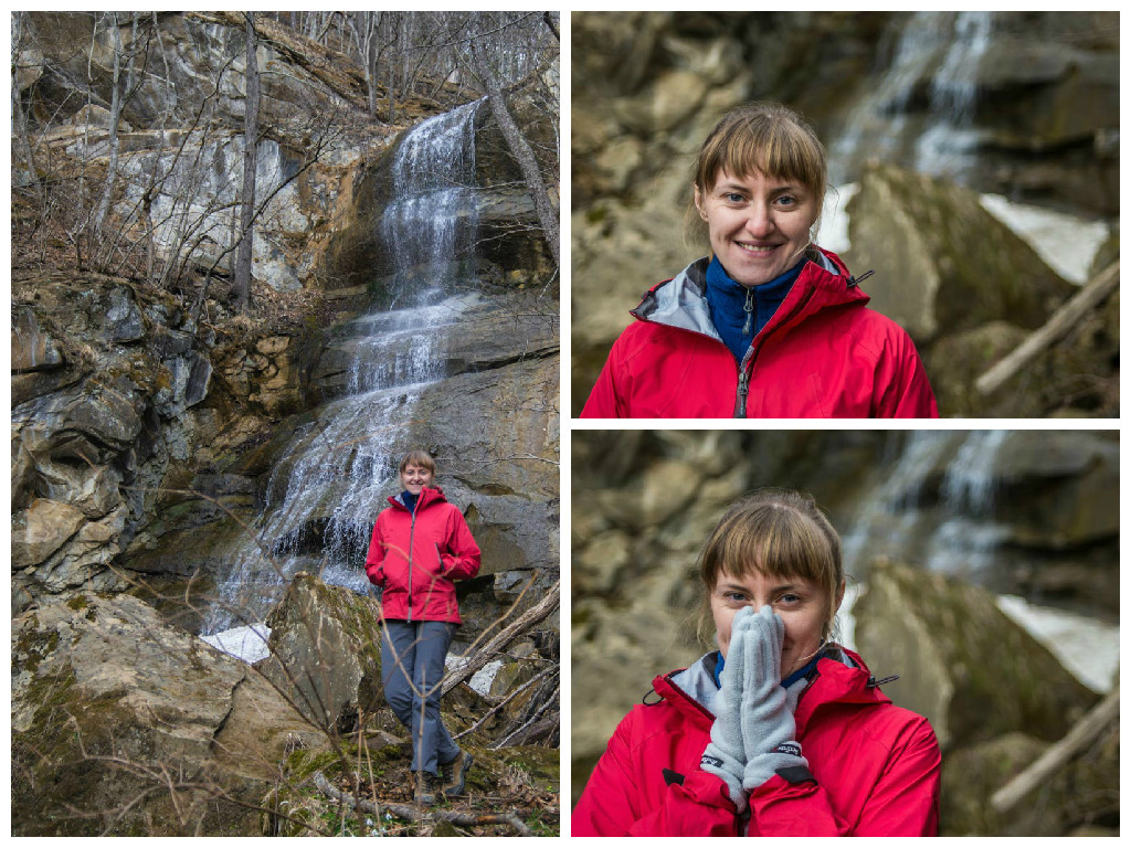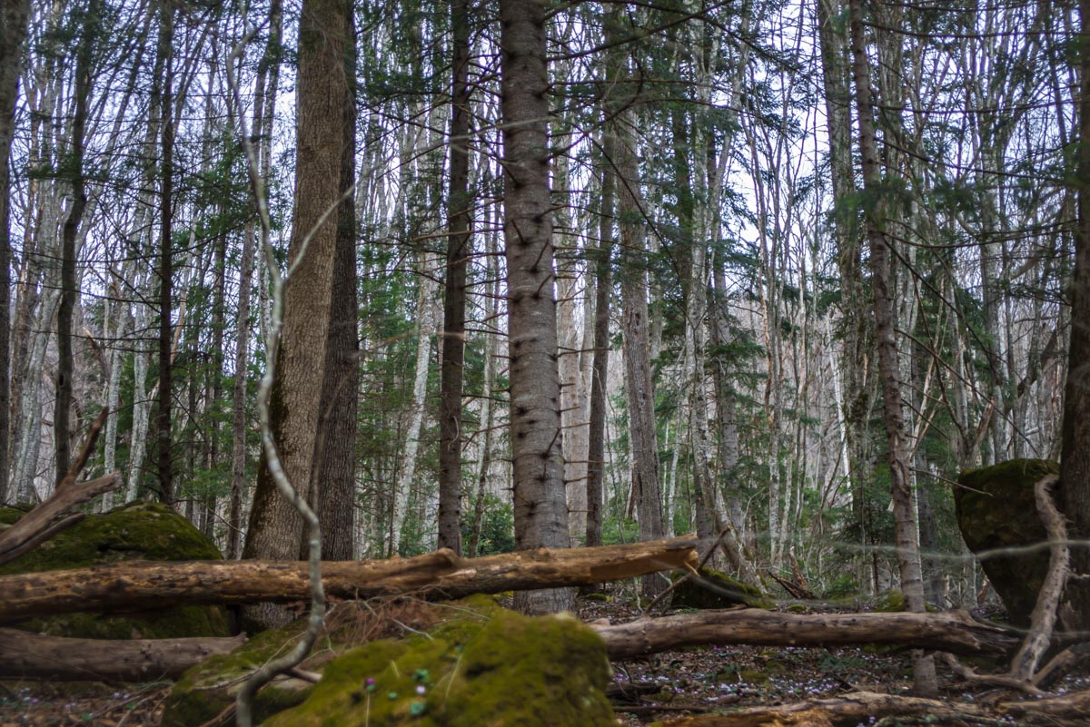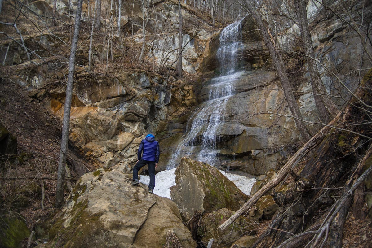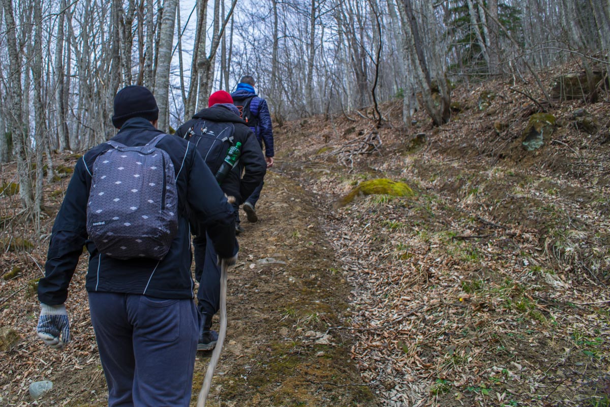 После брода идите все время по дороге до развилки. Вам нужно туда, куда ведут красно-белые метки, направо. Следующая развилка будет через несколько сотен метров, и вот теперь нужно выбрать то направление, которое не сопровождается метками, то есть взять левее. Дальше дорога становится все хуже и хуже, а в какой-то момент и вовсе пропадает. Держитесь все время реки, тропы здесь нет, идти вдоль нечищеного русла очень неудобно. Лучше прокладывать путь поверху, через лес. Спустя какое-то время вы доберетесь до слияния двух ручьев в одну реку. Следует выбрать правый приток и все время подниматься наверх вдоль него. Правый орографический берег для этого удобнее, но в целом выбор не имеет значения. Если никуда не сворачивать, то совсем скоро вы упретесь в водопад.