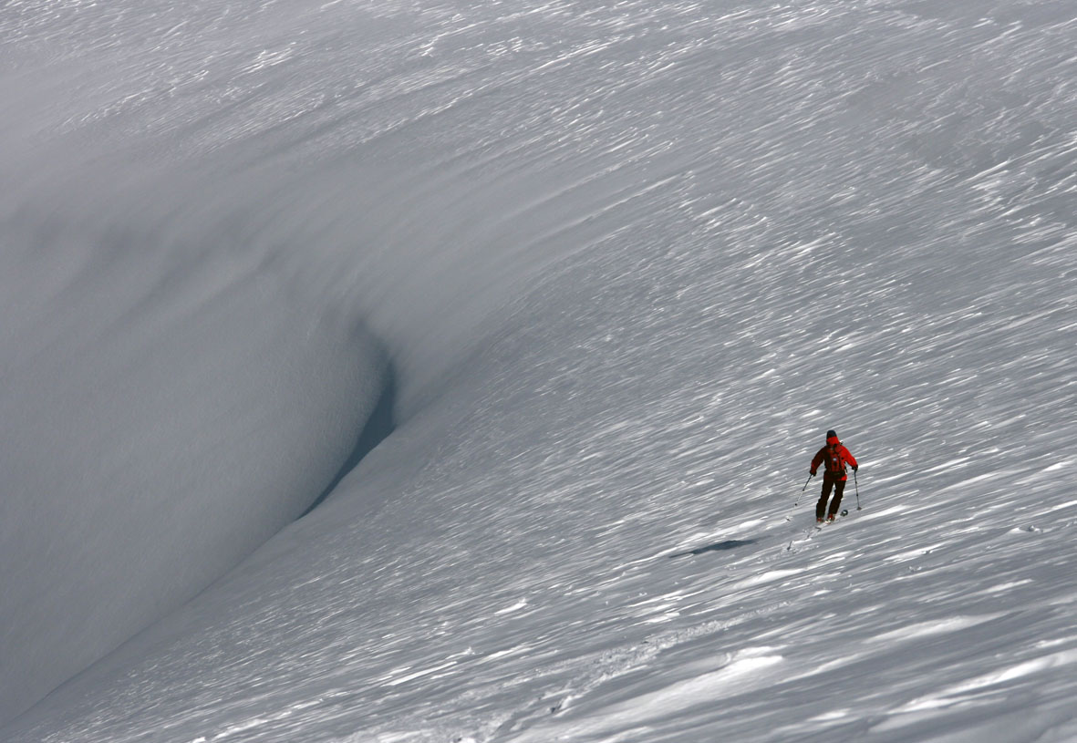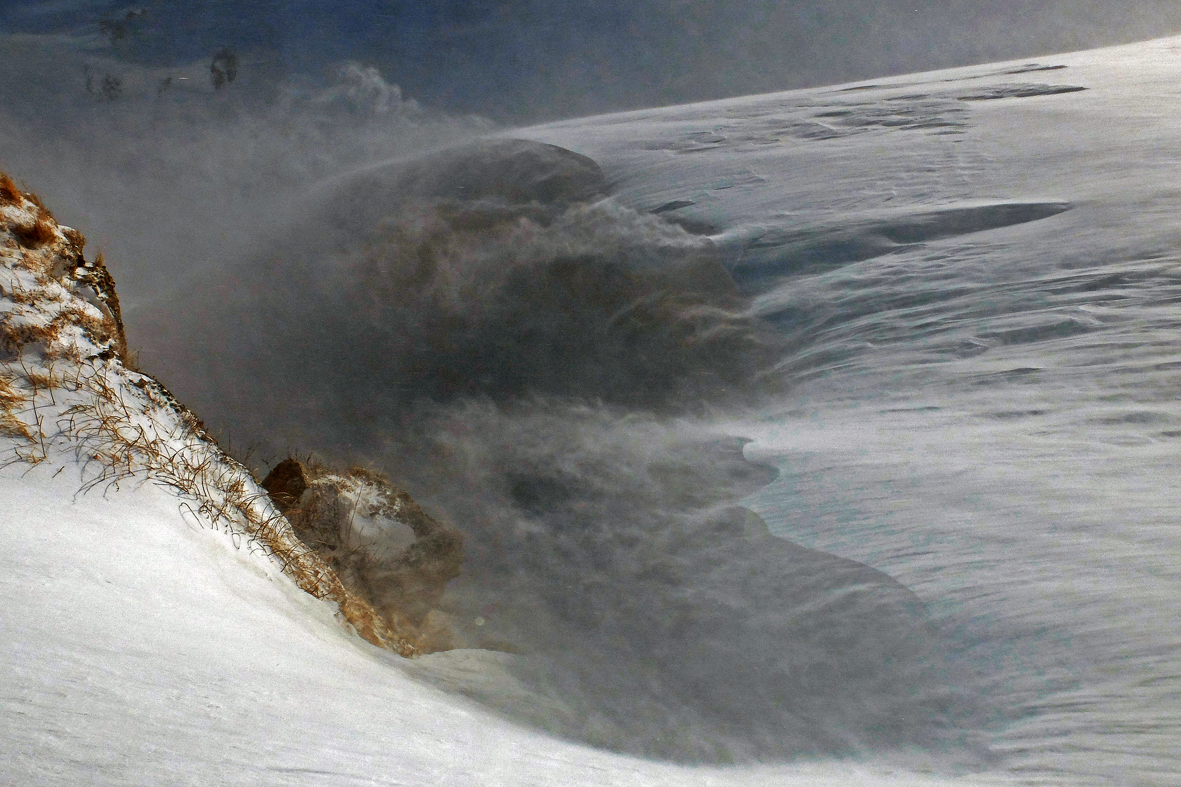 Образуются большие карнизы. Опасно как падение с карниза, так и обрушение самого карниза. Обрушение может вызвать сход лавины по нижележащему склону