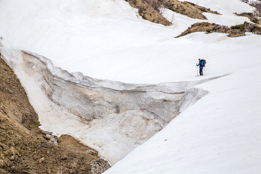 Опасность лавин из досок и мокрых лавин на коротких крутых склонах. Как раз по ним и проходит туристская тропа.